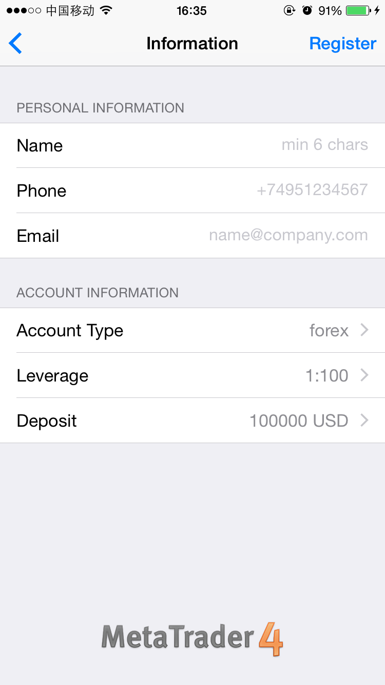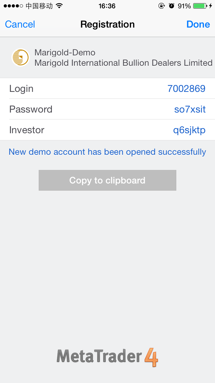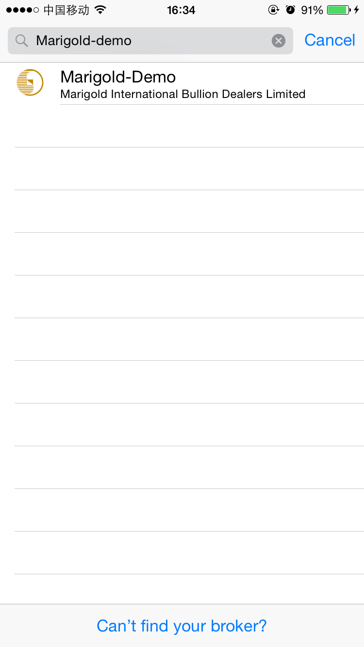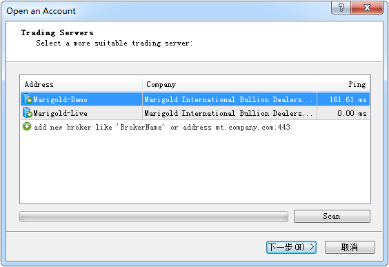New Account - "open a personal demo account", enter "marigold" (Company name or server name) in the server in the search box and select "Marigold-Demo", fill in personal information and then "Registration", then press "Finish" to return.