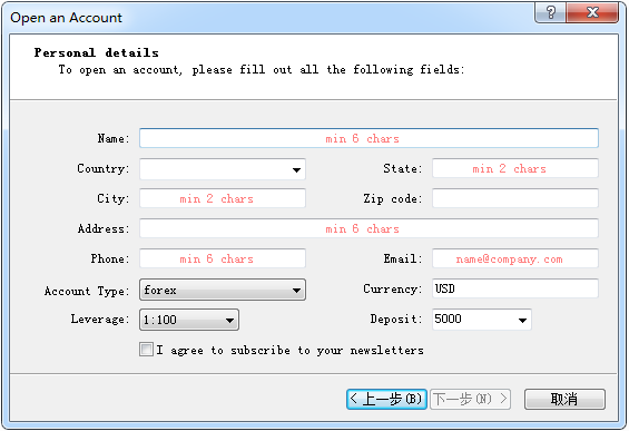 Enter the required information, and select "I agree to subscribe to your newsletters" in press "Next" to complete the demo account application.