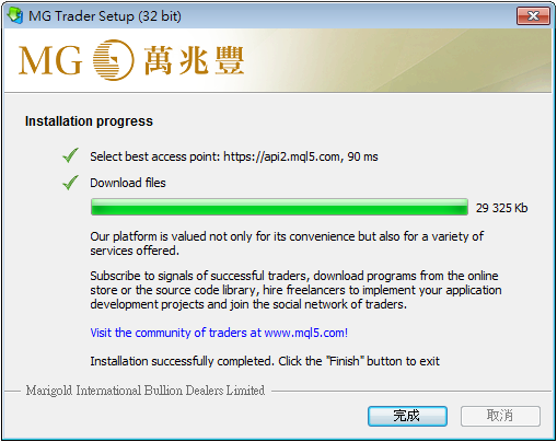 交易平臺下載完成,按「完成」啟動自動安裝程序。