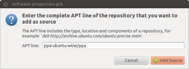 The following data should be specified in АРТ (Advanced Package Tool) line: ppa:ubuntu-wine/ppa. Click "Add Source". This completes the preliminary setup.