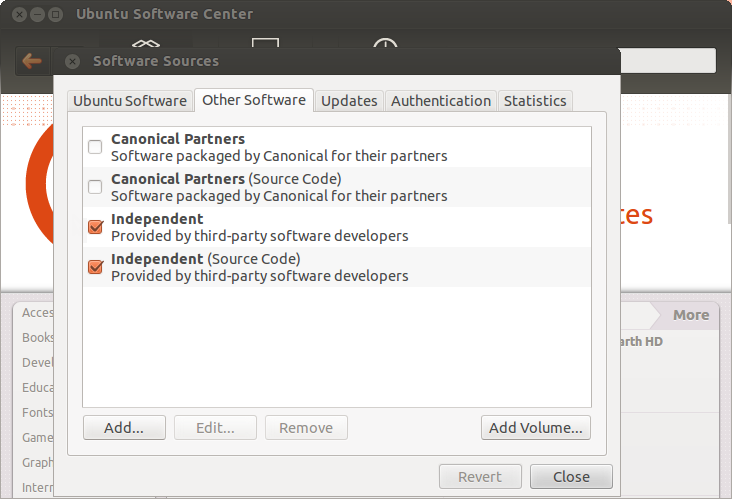 Preliminary setup should be performed before the installation. All applications are installed on Ubuntu from the packages contained in repositories. The path to WineHQ PPA repository should be added to install Wine. Open Ubuntu Software Center and execute "Software Sources" command in "Edit" menu.